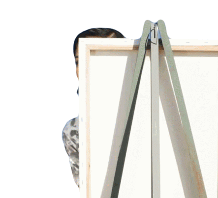 Jhené Aiko peeks from behind a white canvas, looking around with a curious and then approving smile.