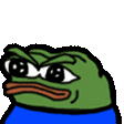 A pixelated green frog character, known as Peepo, with large eyes and a blue shirt, used as a meme or emote.