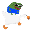 A happy Peeposhortonagoose, the green frog, rides joyfully on the back of a running white goose.