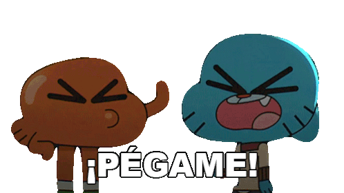 Gumball Watterson defiantly challenges Darwin Watterson, shouting "¡Pégame!" (Hit me!) in a tense moment.