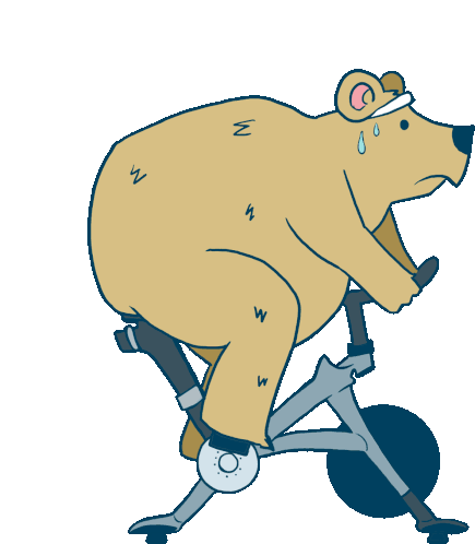 A determined cartoon bear in a headband sweats while vigorously cycling on a stationary Peloton exercise bike, working out.