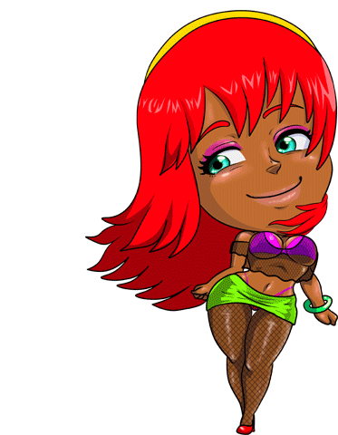 Pelucazo, a cute chibi girl with vibrant red hair, green eyes, and a stylish outfit, strikes a playful pose.