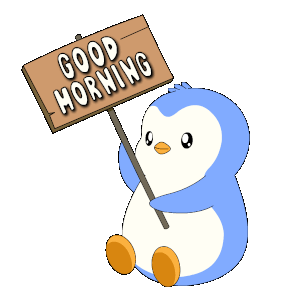 A cute animated Pengu Gmeow penguin holds up a wooden sign that cheerfully says "GOOD MORNING" to greet the day.