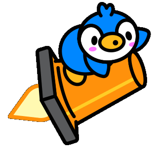 A cute cartoon Penguitt penguin with pink cheeks rides an orange rocket, launching with a fiery yellow exhaust.
