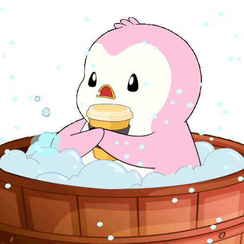 a pink penguin is taking a bath in a wooden barrel