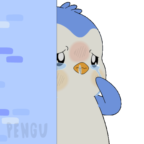 a penguin is crying behind a blue wall and the word pengu is on the bottom right