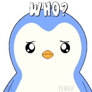A cute Pengu Pudgy penguin sticker with a curious and concerned expression, asking 'WHO?' with raised eyebrows.