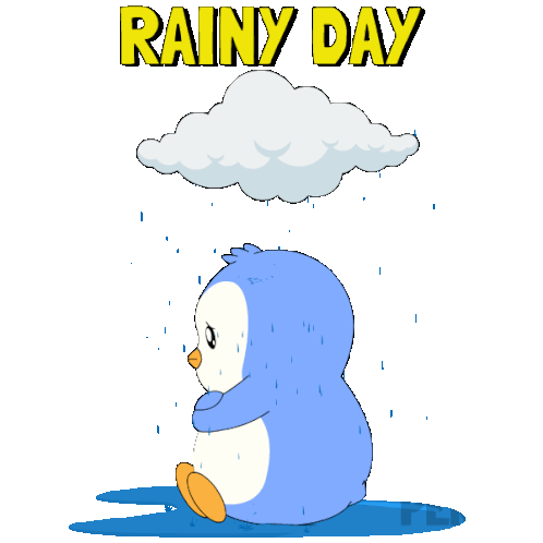 a penguin is sitting in the rain with the words rainy day above it