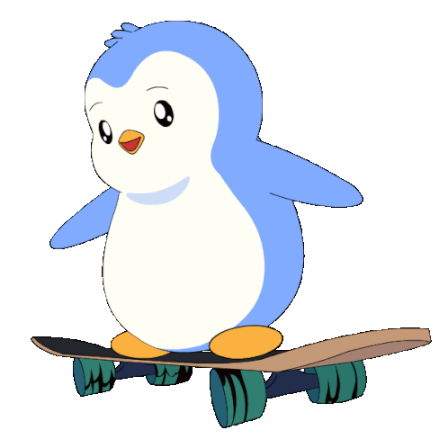 a blue and white penguin is riding a skateboard on a white background