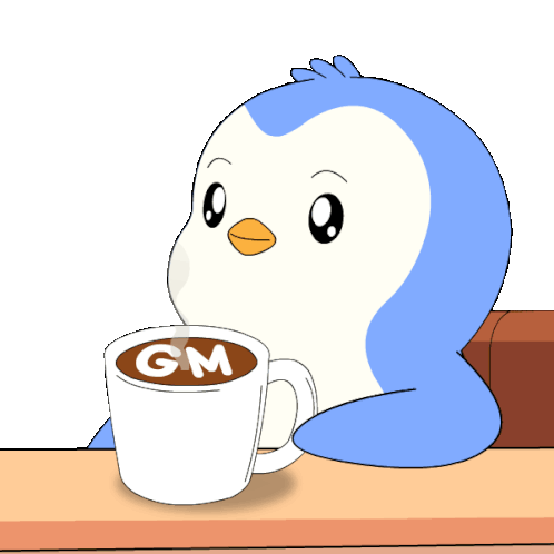 a penguin is sitting at a table with a cup of coffee with the letter gm on it