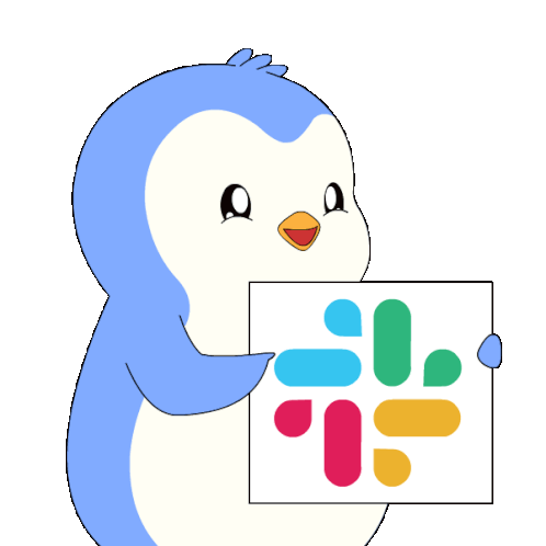 a penguin is holding a sign that says slack on it