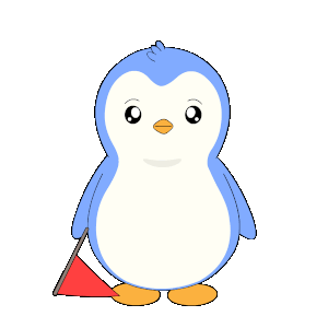 a blue and white penguin holds a red flag in its hand