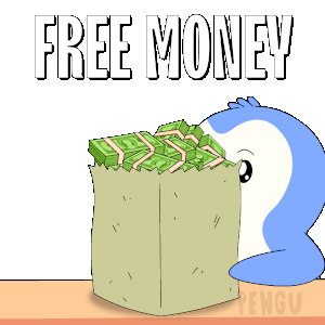 A cute Pengu Pudgy penguin happily presents a bag overflowing with stacks of cash, with 'FREE MONEY' text.
