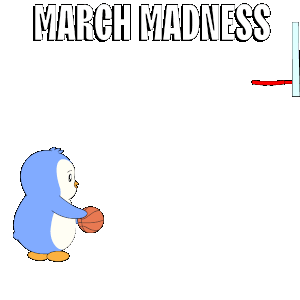 Pengu Pudgy the penguin attempts a basketball shot during March Madness, missing the hoop in this animated sticker.