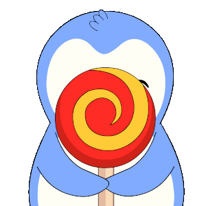 A cute Pengu Pudgy penguin playfully hides and reveals its face behind a vibrant red and yellow swirl lollipop.