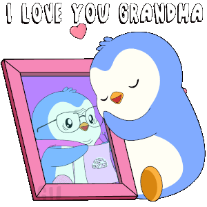 Pudgy Penguin lovingly hugs a framed picture of his grandma, with 'I Love You Grandma' text and floating hearts.