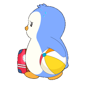 Pengu Pudgy, the sad penguin, is ready for vacation with a red suitcase and a colorful beach ball, looking tired.