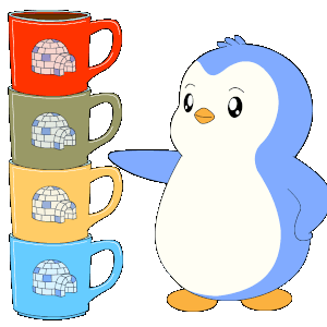 Pengu Pudgy, the adorable penguin, points to a vibrant stack of four mugs, each adorned with a cute igloo design.