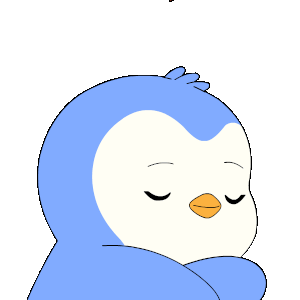 A cute blue Pengu Pudgy penguin wakes up, smiles, and has an autumn leaf on its head, showing happiness.