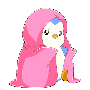 Pengu Pudgy, the adorable penguin, is wrapped in a cozy pink blanket, looking tired and sleepy.