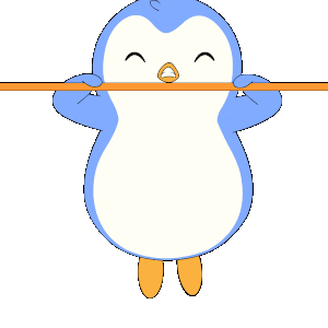 Pengu Pudgy, the blue and white penguin, performs a determined pull-up on an orange bar, showcasing strength and fitness.