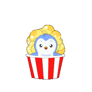 A cute Pengu Pudgy penguin happily sits in a red and white striped popcorn bucket, surrounded by popping popcorn.