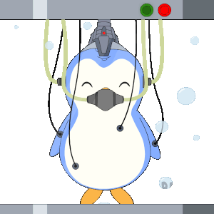 Pengu Pudgy, a cute penguin, floats in a futuristic test chamber, wearing a breathing mask amidst bubbles.