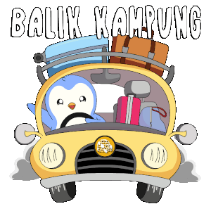Pengu Pudgy the penguin drives a yellow car packed with luggage, celebrating 'Balik Kampung' homecoming.