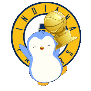 A cute Pengu Pudgy penguin celebrating with a golden basketball trophy in front of the Indiana Pacers logo.