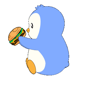 Cute Pengu Pudgy penguin holding a delicious burger, waving hello with a friendly gesture as 'HI' text appears.