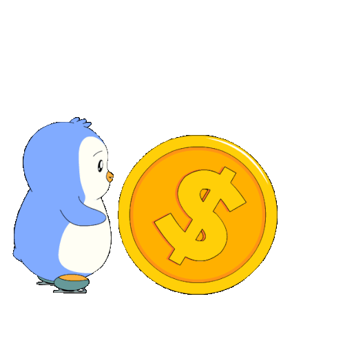 A cute Pudgy Penguin on ice skates pushes a large golden dollar coin, symbolizing wealth and ambition.