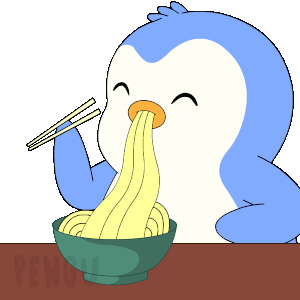 Pudgy Pengu, the cute blue penguin, happily slurps ramen noodles from a bowl using chopsticks.