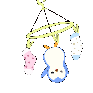 An adorable animated baby mobile featuring a sleeping Pudgy Penguin, pink and blue socks, and floating bubbles.
