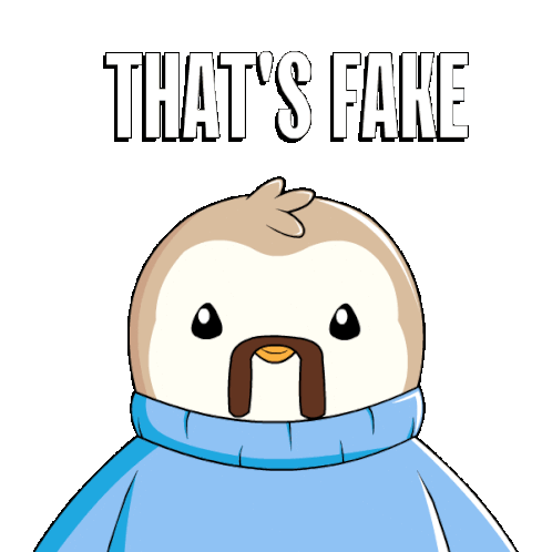 A cute Pudgy Penguin character shakes its head, declaring 'THAT'S FAKE' to dismiss misinformation or lies.