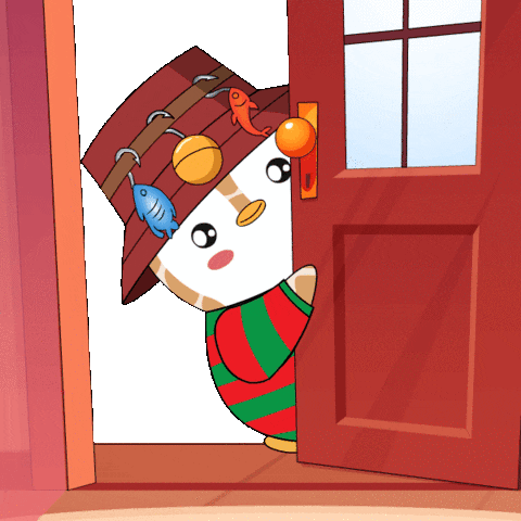 A curious cartoon penguin, wearing a fishing hat and striped outfit, peeks from behind a red door with wide eyes.