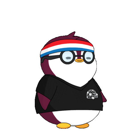 A pudgy penguin character, wearing a headband and glasses, appears to blow a whistle, then stands attentively.