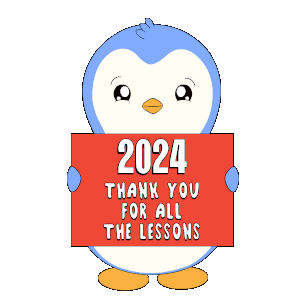 A cute penguin holds a sign, first thanking 2024 for lessons, then declaring readiness for 2025.