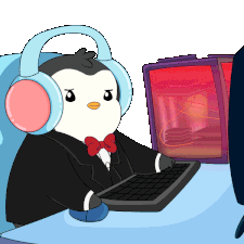 Pudgy Penguin, wearing headphones and a bow tie, intently types on a computer keyboard, engaged in a gaming session.