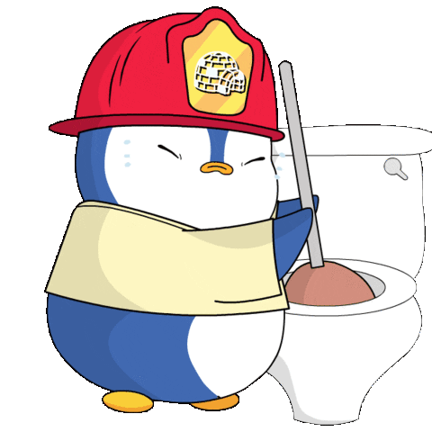 A cute cartoon penguin in a fireman's hat waddles with a plunger next to a toilet, ready to fix a clog.