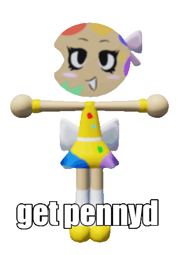 Penny Acrylis from Stars Circus spins playfully, displaying the phrase 'get pennyd' in this animated sticker.