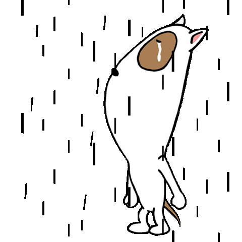 A white cartoon bull terrier dog stands sadly in the rain, looking up with a single tear rolling down its cheek.