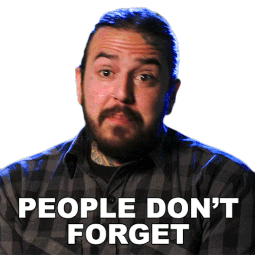 Toni from Ink Master delivers the memorable line 'People Don't Forget' with a serious then smiling expression.