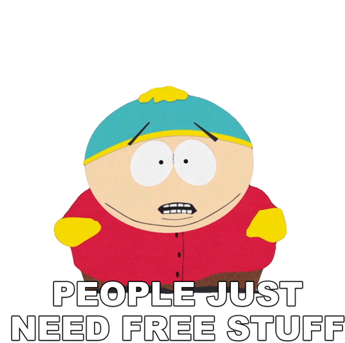 Eric Cartman from South Park expresses his cynical view that people only care about getting free things.