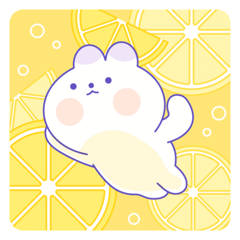 An adorable white creature with pink cheeks floats happily amidst bright yellow lemon slices and bubbles, embodying a cheerful swimming vibe.