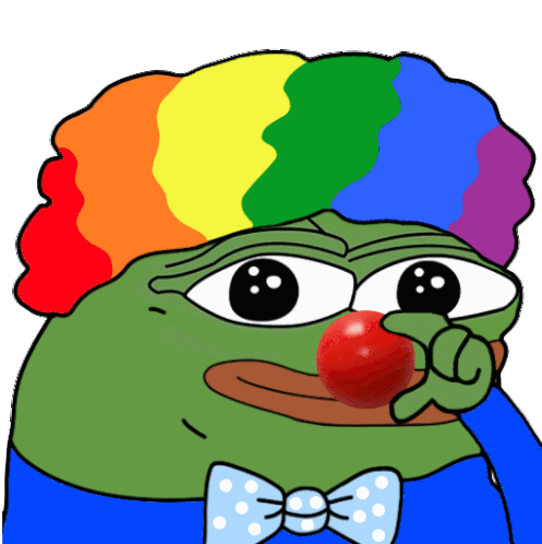 Pepe the Frog dressed as a clown, featuring a vibrant rainbow wig, a bright red nose, and a polka-dotted bow tie.