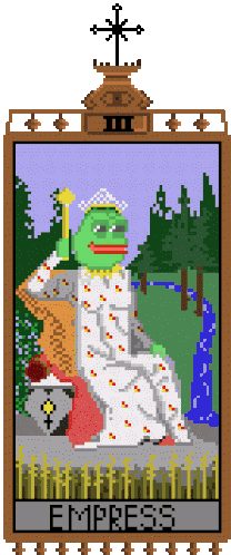 Pixel art sticker featuring Pepe the Frog as The Empress tarot card, seated on a throne with a scepter.
