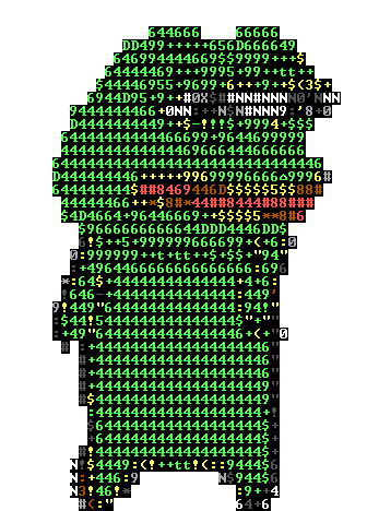 Peppo, an ASCII art character, performs a lively dance, showcasing dynamic movements in green, yellow, and red.