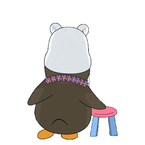 An adorable penguin wearing a polar bear hat and a lei, sitting next to a stool, with the word "PERFECT" above.