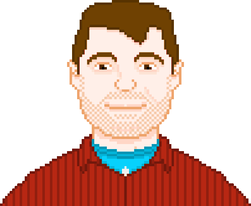 Pixel art sticker of comedian Mitch Burrow from Permanent Comedy, blinking and smiling.