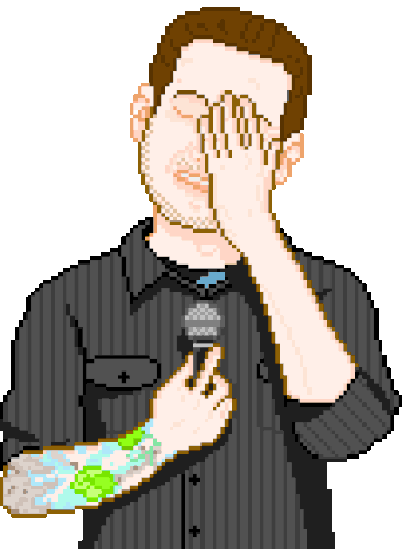 Pixelated comedian Todd Armstrong performs stand-up, holding a microphone and doing a classic facepalm gesture.